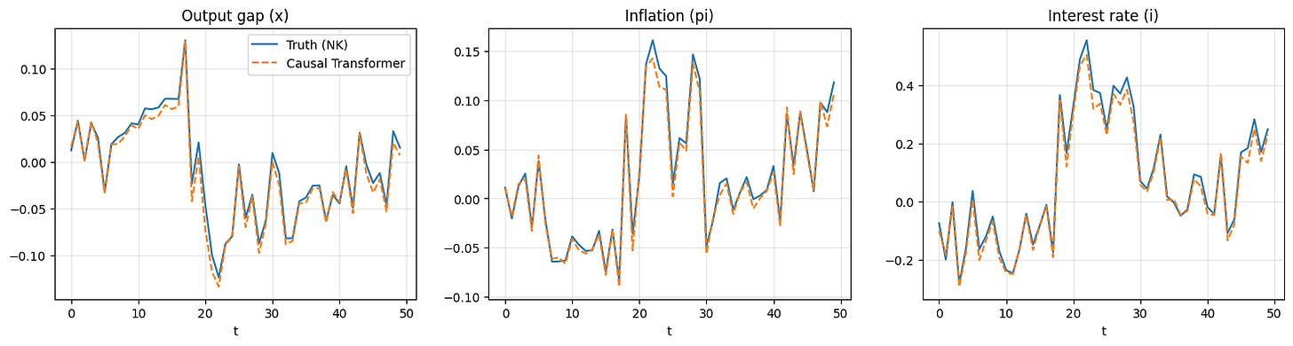 Before getting to the results it’s worth clarifying what this experiment is doing, as well as its limits. The question it’s answering is the following: let’s assume that the real model of the economy is NK. The transformer model sees data from this economy and predicts a policy response. Like the econometrician, it has the history until time t and must forecast the state of the economy in period t+1. How well does it do? If it does well, what does this mean? It means that given the underlying model of the actual economy (which may or may not be NK), the transformer will be able to “learn” the DGP at least well enough to make well calibrated predictions. Here is what the experiment cannot answer: 1) will the predictions change if the relationships between variables change, 2) does the model actually encode the DGP in a way that can be elicited (research by Keyon Vafa and others makes us pessimistic on this), 3) are the predictions robust to extreme policy shifts? Beyond these limitations, the obvious one is welfare analysis: the black-box nature of the transformer model prevents the researcher from saying much about welfare given various counterfactuals, which the structural approach allows for by design. But here is one aspect of the exercise that we do not view as a limitation: the NK model has a fairly simple structure—perhaps the transformer model is able to make predictions from data simulated in this framework, but it will do a lot worse if the structure is more complex. While this would certainly be a limitation for the transformer-based approach, the same critique can be applied to the structural approach. Specifically, if the NK model is too simple to generalize from the transformer approach, it is also too simple to model the economy.