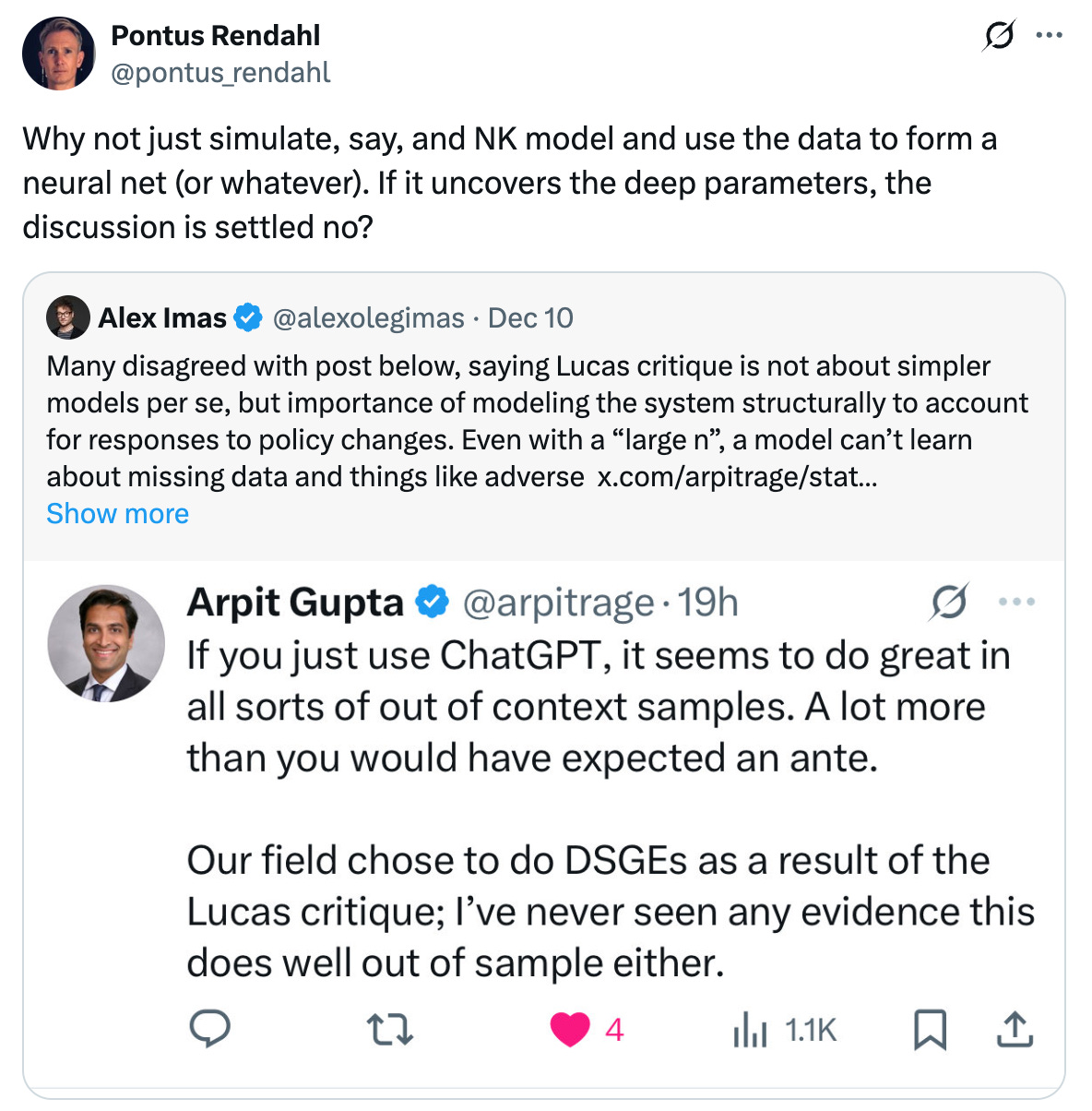 However, simple transformers alone do not abolish the Lucas critique. If the goal is accurate counterfactuals for policy, rough approximations aren’t enough. You probably want greater assurance that the model’s internal representation is close enough to reality so as to be comfortable relying on the model for guidance. Of course, the same challenge applies equally to the DSGE objects in modern macro, which have had mixed success in forecasting and prediction.