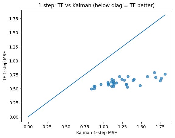 To address some of these issues, we created another experiment in which we have a causal transformer as before, but it observes only the y variables, i.e. it has none of the benefits of observing structure. We compare this to a Kalman filter, which is a reduced form model with a similar handicap of not inherently matching up to the precise design of the NK experiment. We then show the MSEs of the two approaches below, which show the transformer (TF) substantially outperforms the Kalman filter.