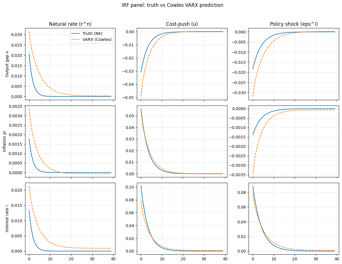 Great essay btw, big fan of applying transformers to other domains. Meanwhile, I skimmed the code. Think your solve_policy_matrix solvest eh wrong linear system, it's NK-like not NK I think. M = np.kron(R.T, A) + np.kron(I3, B) (+ instead of -) . also since R is diagonal you could just solve column by column, would be easier. The pooled varx is also thetea agnostic btw.