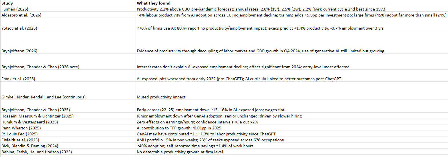 In this post I review and summarize the current literature on the productivity impact of AI. There has been a lot of debate on the news and social media on whether AI is actually having the promised impact on productivity, if yes, where it is showing up, and who is becoming more productive. This debate has been particularly urgent with the rolling out of AI agents such as Claude Code, which seem to be able to automate a really huge array of tasks (though it’s too early for these tools to show up in the numbers):