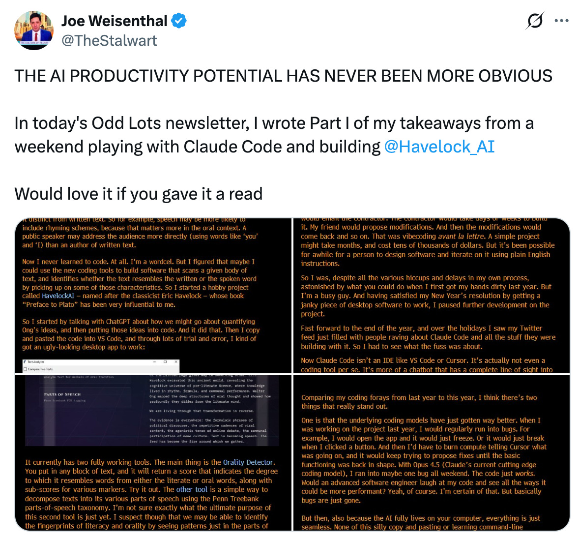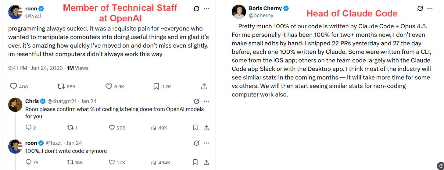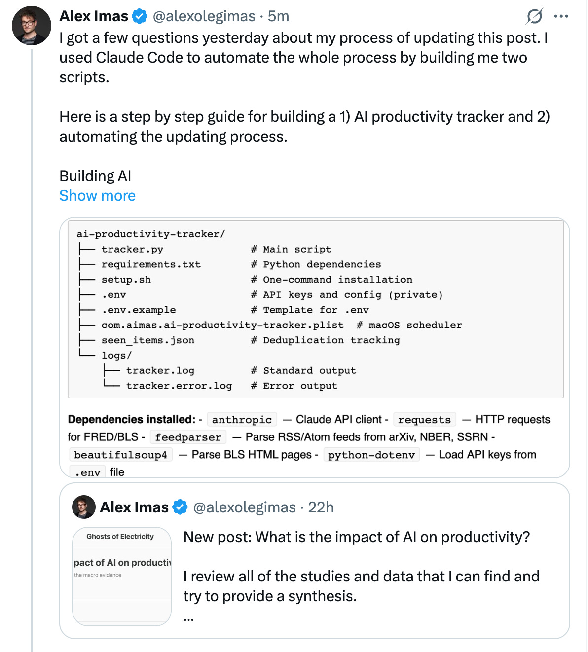 Jobs are a collection of tasks. Even if some tasks are sped up, those that are not act as bottlenecks for productivity growth at the job level. A software developer who can write code twice as fast still has to wait for code reviews, attend meetings, coordinate with teammates, and navigate organizational processes. Tasks that are not assisted by AI may even take longer if workflows are not optimized to integrate with LLM output. Bottleneck tasks will slow down the emergence of AI gains in the aggregate data, but organizational re-structuring, training, and improvement in tools will reveal the productivity impact sooner than later. For example, AI agents such as Claude Code are beginning to automate and speed up tasks that were done manually only weeks ago. See Anthropic’s Boris Cherny and OpenAI’s (probably) roon on how much code they’re writing these days: