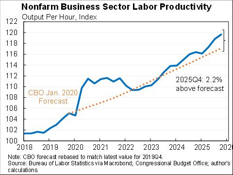 Jason Furman (2026): Analyzing new BLS data with upward revisions, Furman notes that nonfarm business sector labor productivity now sits 2.2 percent above the Congressional Budget Office’s pre-pandemic (January 2020) forecast. Annual productivity growth rates stand at 2.8 percent over one year, 2.5 percent over two years, and 2.2 percent over six years. Using peak-to-peak measurement to strip out cyclical distortions, the current cycle (2019Q4–2025Q4) shows 2.2 percent average annual productivity growth—the second-best since 1973, trailing only the dotcom era, though average for the full postwar period. Furman, previously skeptical that AI was showing up in aggregate data, now agrees with Brynjolfsson’s assessment, citing both the revised aggregate data and the accumulating business-level studies as evidence that AI may be contributing to the productivity gains.
