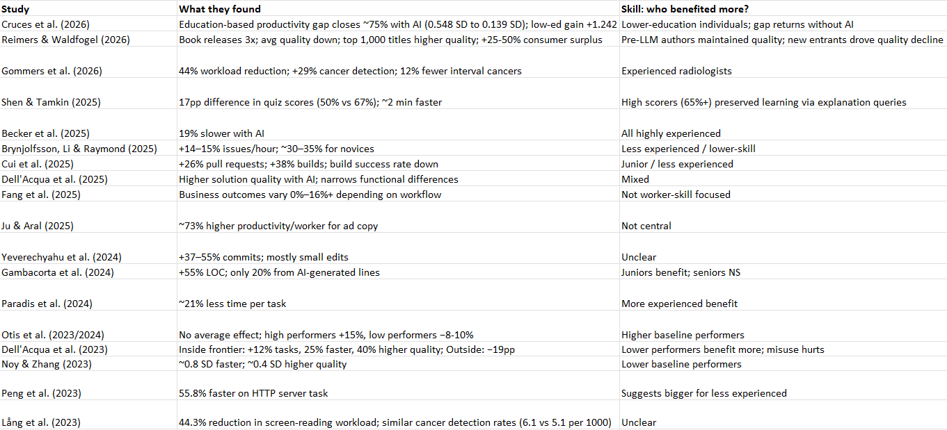 This post is intended as a living resource. I will update it periodically as new evidence accumulates. The current version reflects research available through March 2026. While this post will be regularly updated with studies and new productivity data as it comes in, I will only update the front end of the post if the narrative begins to shift.